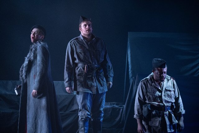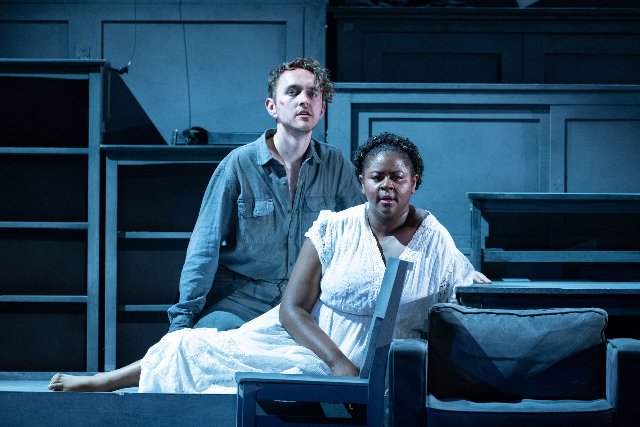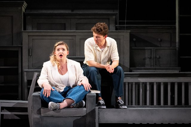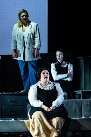 Director Jan Essinger’s staging is simple yet striking. Sonja Füsti’s sets are monochromatic gray. In the camp scenes, gray sheets draped over objects comprise the set. In Lucinda’s home, the sheets are lifted to reveal a stage full of gray furniture pushed together as if in storage. The somber notes are appropriately accentuated by David Robertson’s dim lighting and Christine Cook’s contemporary drab costuming.