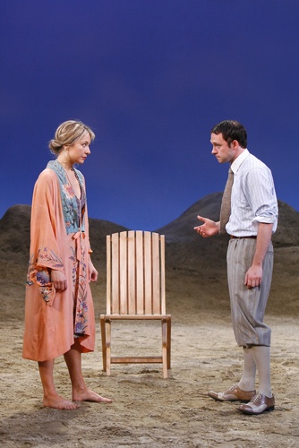 Part of the issue was a conscious decision by Whittell which he discussed with me both before and after opening night that he did not want to give the play what he called a "Merchant and Ivory" treatment. This is to say a costumed period piece. For precisely that reason Sara and the men that surround her perform like contemporary players who have been plopped down by some time machine onto the beach of Cap d' Antibes. The setting and action are as arid as the beach on which it is staged with a rather clever set by Mimi Lien and the effective lighting of Thom Weaver. There isn't much in the way of costumes other than beach attire. Ernest is incongruous in cutoff shorts. That style is more 60s than 20s. Scott is made to appear absurd in some ersatz Indian getup from a drunken costume ball the night before and later appears on the beach to go swimming in knickers and knee socks.