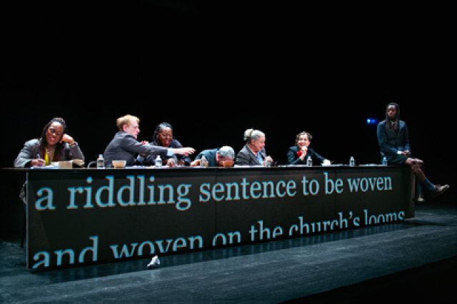 As the work progresses, the banquet table divides into three parts. A rush of language is projected about the stage, indicating passages of the book not to be heard. They ran in full on a screen at the back of the theater. One audience member craned his neck to view the language. It might have worked better on a screen as we faced forward. Gesture was so handsome and apt that one wished that the director had simply left the work as spoken words and gestures. Paper planes and then papers littering the set distracted rather than enhanced.