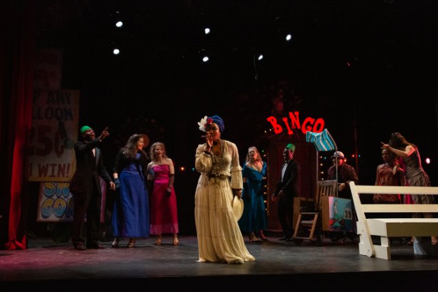 Then shit happens. It seems a terrible storm is brewing. The showgirl says not to worry she has seen lots of storms ravish Atlantic City. But it morphs into a riff about Noah. There is an ark tied to the pier which is breaking up. He reverts back to getting his family on board but the problem son Henry/ Cain (Marcus Gladney, Jr.) has gone missing. There is also a daughter Gladys (Claire Saunders) now with child.
