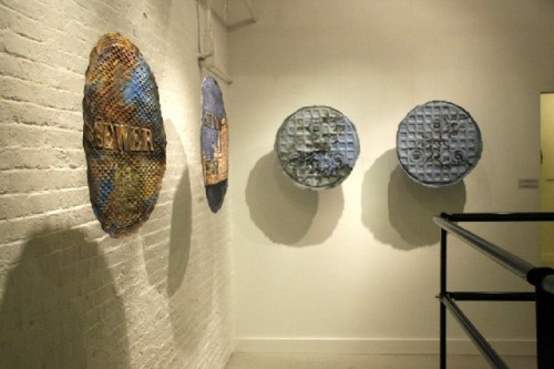JIA I am using some painting; collage, drawing with charcoal and pastels and thread. I like making the work in layers with imagery on top of the embossed pattern from the manhole covers. I like that people can look at the pieces far away and see one thing and then get closer and see more. I hang the pieces out from the wall without frames so that the viewer is confronted with them more directly and I also like the shadows cast by the pieces hanging in space.