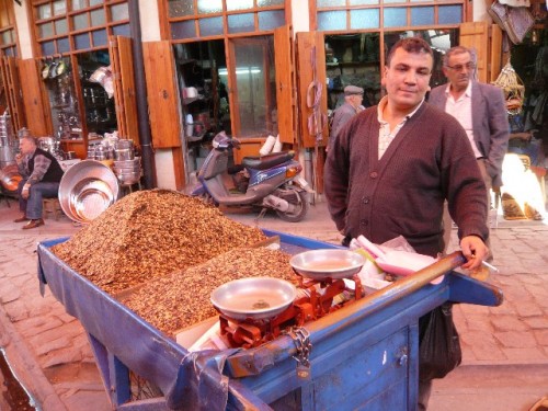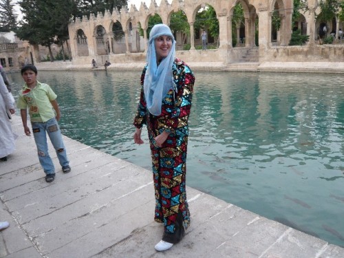 Urfa's bustling ancient bazaar is a cross-section of life in the city. An overwhelming feast for the eye, the typically Eastern bazaar is crammed with small shops of copper workers, tobacco vendors and fabric stalls. Heaps of silk or polyester, mostly imported from across the border from Syria and therefore cheaper, beckon women, who buy the fabrics as head covers. I bought a square piece of local black silk with a colorful swirling pattern from a vendor who spoke Turkish to me and Arabic to his assistants.