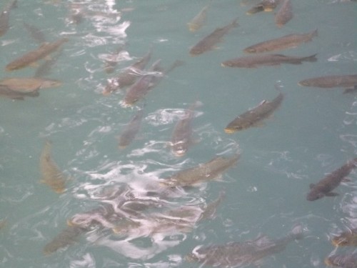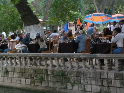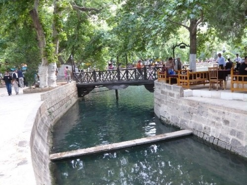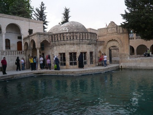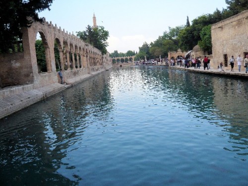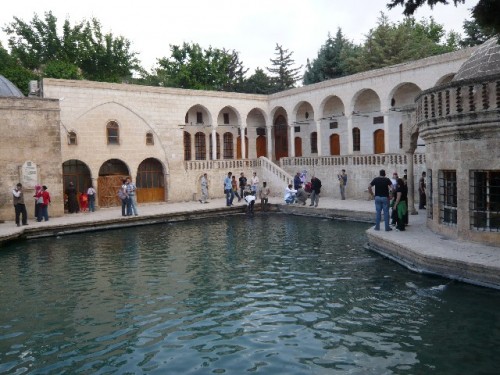 Abraham is said to have been born in a cave. People travel long distances to visit his birth place. Men and women go through separate doors to enter the respective prayer chambers. Women must have a head cover and clothing with sleeves. The cave is by a pool surrounded by a religious complex and attractive gardens. Hundreds of plump carp frantically devour bread thrown by visitors in the pool, fed by a spring at the foot of the citadel. According to legend, King Nimrod, who ruled over Urfa, had Abraham immolated on a funeral pyre for destroying crosses, but God turned the fire into water and the burning logs into carp. So the carp is considered sacred and feeding it a holy act.