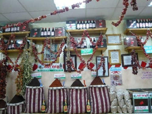 The legendary local pepper Isot is unique to Urfa cuisine. Ground hot peppers come in different shades of color and intensity based on the recipe and are sold in specialty shops. We visited the Isot Evi (House of Isot), with chains of dried red peppers looped around the shop giving it a festive look. Big bags of ground peppers ranging from almost black to light red sat on the floor. Each bag was labeled differently, for example for meat balls or dishes with sauce etc. The group stocked up on a variety of peppers, sold by the kilo or gram, to take back to Istanbul.