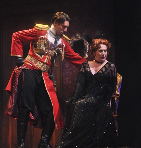 The costumes by David Murin nicely advanced the mood and period. Husband and wife were dressed exquisitely. He wore that absurdly overstated Guardsman’s costume. She had a variety of very theatrical gowns which she swished about with great flourishes. Mama was given a shock of red hair which in the semiotics of the era signifies a woman of questionable virtue. Clearly, Mama knows the ropes of the love game.
