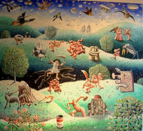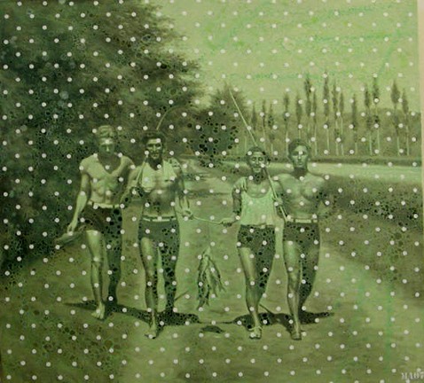 Although there was no theme as such to the show there was a unifying thread of aspects of figuration and narrative. Bulkeley has long been known for whimsical elements. A painting in this show, for example, includes humorous references to his favorite artists from Beuys to Guston. There is a similarly over the top sensibility in the Bergstein paintings in which a man seems buried by or emerging from a pile of trash with a gun in his hand and a pipe in his mouth. Boyajian embeds figurative, narrative elements in her pristine landscapes. In the Antic canvas he layers a vintage image of his family in bathing suits walking down a street with fish they have caught. Over this he paints a series of stripes and polka dots.