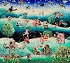 The fun in this game is that one artist makes a drawing, often in a humorous manner, and the next guy adds to or changes it. Because of the complications of glaucoma, which prevents him from working on large canvases, Bulkeley amused himself over the past year by making drawings on 7 x 10" sheets of paper which were then circulated by mail among friends. He was delighted by the results which have been included in a grid of images in the exhibition "Boston Ten" which currently occupies one half of the Ferrin Gallery in Pittsfield.