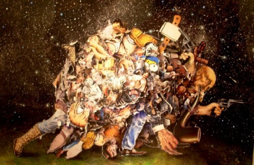 Several years ago the artist Morgan Bulkeley moved to the Berkshires. In 2006 after an opening with a group of ten Boston artists, at Lascano Gallery in Great Barrington, he invited them to join him for an after party. One of the artists brought some paper and pencils. They passed the sheets around and played a version of the surrealist game Exquisite Corpse. The original idea is that an artist drew a head, folded it over, and the next artist added something, folded it over, and passed it along. After the last participant the sheet is unfolded to reveal the resultant figure in several hands and styles.