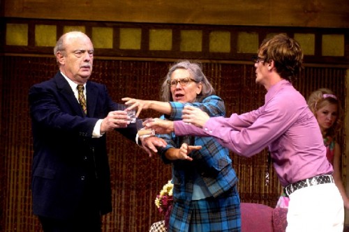 By the end of the performance Brian Avers who portrays Brindsley with remarkable energy is soaked right through his shirt. The direction has him stumbling and bumbling madly about including a pratfall down the stairs from his balcony bedroom where he has stashed Clea. He is looking forward to a tumble in the sack with the ex after he has consummated a sale to Bamberger and dispatched the cute but straight little Carol and her father. Carol is the better prospect for a starving artist but Clea is more of a turn on. So he is caught between the prospects of love/ sex or money. It is going to be one or the other. Perhaps Brindlsey, who is rather clever, can manage to marry Carol and keep Clea on the side.