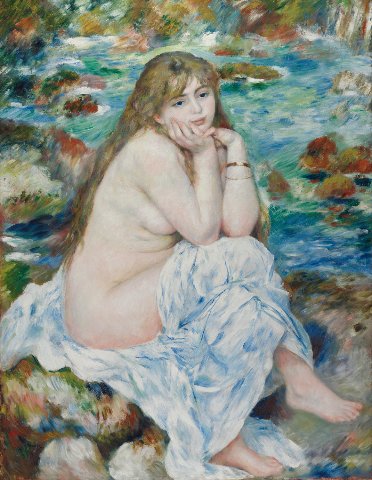 The Salons were full of nudes in the classical/ allegorical manner. They depicted women as fantasy. That changed with the realists Edouard Manet and Gustave Courbet. Renoir conflated allegory and realism with Diana the Huntress, 1867. The later Bather with a Griffon, 1870 is devoid of narrative elements. The picture’s colors are earthy and naturalistic with well defined forms.