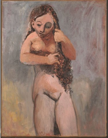 At the center of the show, in more ways than one, there are encounters with Renoir’s most accessible nudes. We are invited to compare and contrast works by impressionist peers Edgar Degas and Paul Cezanne. An intriguing juxtaposition: an austere, distorted Degas Woman Brushing Her Hair, 1884, contrasts with Renoir’s Blonde Braiding Her Hair, 1886. The Degas is a more ambitious work.