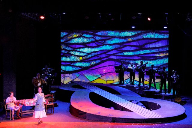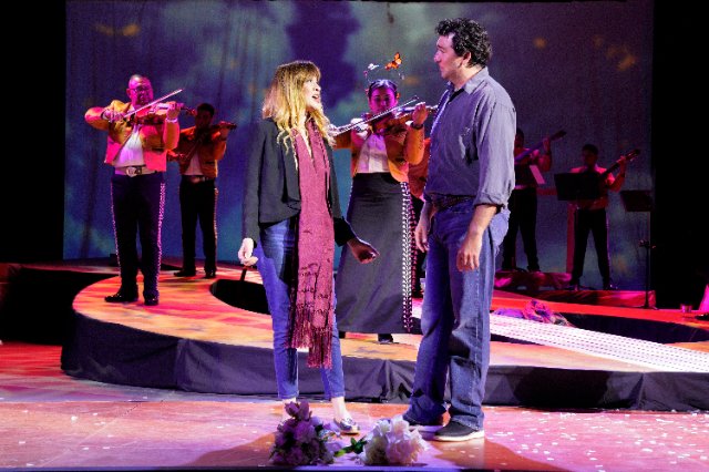 Instead of a traditional opera orchestra in a pit, the Mariachi Azteca band of guitars, violins, and trumpets plays from the periphery of the stage. The melodic music in the mariachi style always engages. Some songs are quite touching with messages particular to the immigrant experience – thoughts like “we never leave the south,” “we always want to return,” and the plea of Laurentino’s first wife Renata “I’m not marrying to receive money through the mail.”