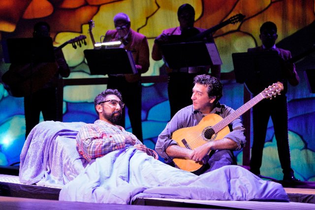 As is fitting, “Cruzar” está mezclado de muchas maneras (is mixed in many ways). As with musicals or operettas, conversation is spoken rather than sung, and songs stand apart with no connective musical recitatives. Although the songs are in Spanish, dialogue shifts between English and Spanish throughout, with the associated shift in supertitles. And to really keep the audience on its toes, the narrative is non-linear in time and place. That said, the storyline is easy to follow because of the cues given in the thoughtful staging.