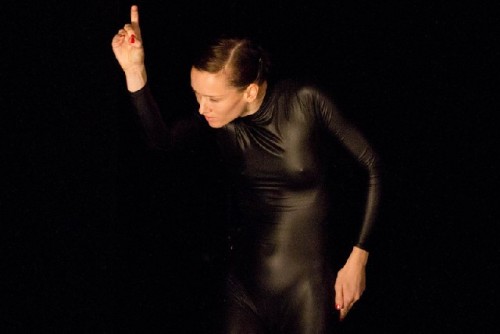 During one segment Bambi sends a beam of light horizontally across the stage. Ever so slowly and deliberately a tall, nude dancer, on spike heels, inches forward with the company flanking and inspired by her. In an unhurried manner she is partnered by a male dancer evoking modern techno love. I wondered why there is this single nude woman while the others, in those clinging and revealing unitards, remained costumed.