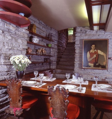 The natural color scheme is set off by Wright's favorite Cherokee Red color applied to windows and various details including a large kettle used for brewing hot drinks. There is a modest looking dining area that allows for flexibility and expansion to accommodate larger parties. The inside/outside aspect of the house underscores Wright's involvement with his nature ethos and the Kaufmann's early concept of conservation and personal involvement with the natural environment.