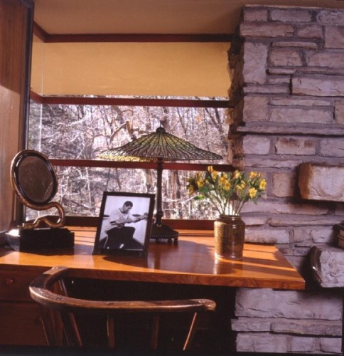 One of the apprentices who was captivated by Wright's 1932 autobiography was a young art and design connoisseur by the name of Edgar Kaufmann jr. He was not into the manual labor required of the other apprentices. But, young Kaufmann had a good car that he could pickup potential clients in and take them to see Frank Lloyd Wright, and more importantly, he was able to introduce Frank Lloyd Wright to his wealthy parents in 1934. The first project that Wright did for the Kaufmanns was to redesign the offices at Kaufmann's Department Store in Downtown Pittsburgh in 1935. This elegant distinctive mostly wood interior is now part of the permanent exhibits at London's Victoria & Albert Museum.