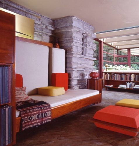 Pillows and throw colors and fabric were chosen by Mrs. Kaufmann. Integrated bookshelves were a Kaufmann detail as well that added color and ornamentation. Built-in seating and polished stone floors tie the living room together with the fireplace which is an asymmetrical focal point. Often Wright would set furniture structurally in the floor so the client could not move it around. Wright just knew better than his clients where things should be placed. This was done in some instances at Fallingwater.