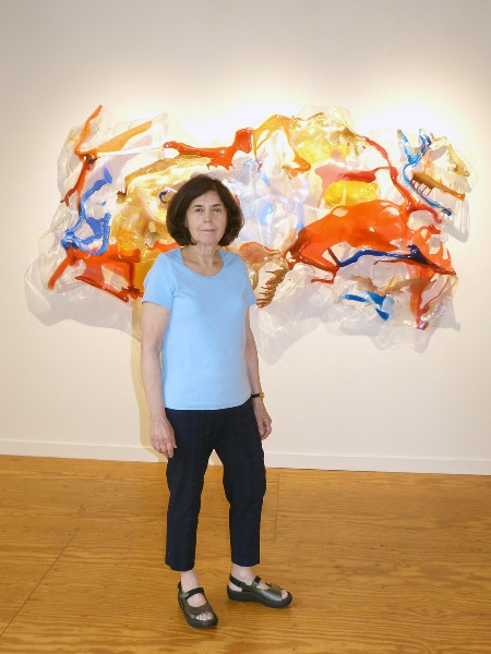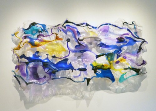 Marjorie Minkin It’s call Evolution referring to my development as an artist and working with Lexan as a material. I started by doing works on canvas which I still do. I created broad sweeps of veiled color on top of each other. I was doing Color Field Paintings but looking for ways to increase the layering and space. There were experiments with all kinds of clear plastic attaching it to the front and back. Then painting on it. Eventually I discovered polycarbonate with the product name Lexan.
