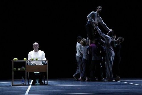 While, in this new work, Jones follows Cage’s adherence to chance operations, he missed its whimsical, Zen spirit. The text of 70, one minute readings were selected from a greater number by a random process. That was combined with the music/ sound of Ted Coffey and the responses of the company often were contained but not limited to a grid of squares on the floor of the stage. There were some props like a couch which was moved about and large, transparent, white, folding screens. These created cubicles which dancers were seen through.