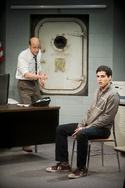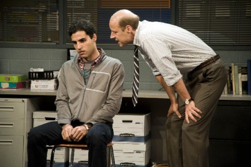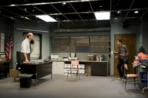 In a generic, cinder block dominated office, with windows (obscured by lowered blinds) leading to a corridor, we find Dr. Danielson at his desk when Khadim enters. The set designed by Brian Prather, with a map of the world, a plot point, on the wall behind the desk signifies no frills public education. It is in marked contrast to the posh private school which Khadim abruptly left under controversial circumstances.