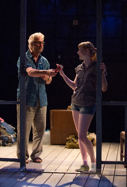 The setting dominates the improbable meeting of two guilt-ridden family members in the “dry” rain forest of Costa Rica, where water caught from the sky is bottled for consumption. Randall Arney choreographs a dance between the two characters which invites the audience in: Sitting facing each other in two banks, with the stage seamlessly positioned between, we are part of the jungle, animal and plant.