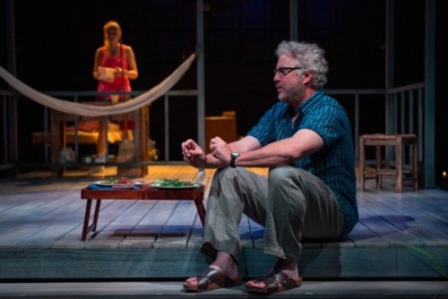 Entering the upstairs theater at Steppenwolf, you are immediately sucked into another world. On a platform stage in the center of the theatre, a windowless, doorless frame divides a porch from the cabin’s interior, a makeshift bedroom/kitchen area, the bedroom set off by an imaginary door. High up, branches of the rain forest hover over the home. Takeshi Kata creates a brilliant setting.