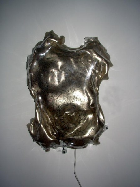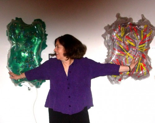 The wall pieces in molded and formed transparent materials by Marjorie Minkin evolved from aspects of abstract painting and sculpture. One of these works was included in an Eclipse exhibition last year. It entailed a sensor and motion detector. As one came in range it triggered a sound which became more intense the closer one approached. Often children were delighted to play with activating the piece. In the past year she has added an element of light to the work as well as the sound.
