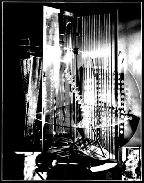 But switched on, plugged in light using an energy source appeared in the work of László Moholy-Nagy (1895-1946) in the Bauhaus. That German art academy was notable for the integration of art and design using industrial materials. In the collection of Harvard University's Busch Reisinger Museum is a mechanical machine that he designed. There were rotating elements played upon by a light source that created evolving shadows cast on a wall.