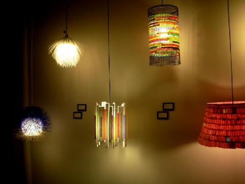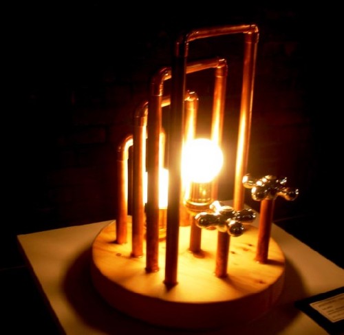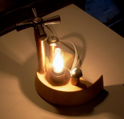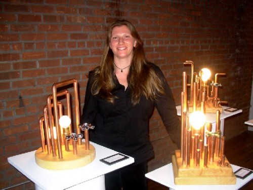 This is the first time that Seitel has curated an exhibition. It is just over a year since she started to create work in the studio. The light pieces in the exhibition which combine copper tubing, antique plumbing fixtures and a variety of light bulbs evolved out of the "practicals" or lighting elements she designed for the student production "Machinal" at Williams College. She began to experiment with these materials as light fixtures which have evolved remarkably in the past year. The exhibition brings together most of what she has created with the exception of a couple of pieces which have been acquired by collectors.