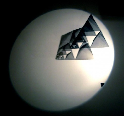 In the tradition of Moholy-Nagy, and the late artist/ curator, Virginia Gunther, (she curated the first contemporary exhibition for the Museum of Fine Arts, Boston "Elements" in 1971) Harrington has installed a Shadow Piece. Using wire screen, he has created a pyramid like relief on the wall. On that is cast a light source which extends and enlarges the profile of the structure.