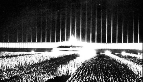 In a less benign manner, Hitler's architect and designer, Albert Speer (1905-1981), surrounded the Nuremberg Stadium with a circle of klieg lights pointed into the night sky to create cathedral of light. He also organized torch light parades including an enormous, rotating swastika photographed from above in the propaganda film "Triumph of the Will" by Leni Riefenstahl (1902-2003). Speer and Riefenstahl both understood the power of the metaphor of light. It is an example of great art used for an evil purpose.