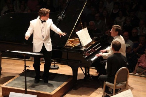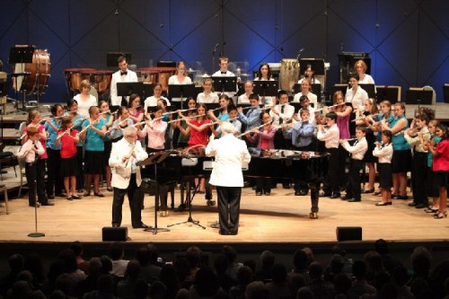 But Sir James was in a playful mood. There was a bit of silliness as the stage was stocked with a parade of kids bearing flutes as well as several of the more accomplished young Tanglewood Music Fellows. Led by Galway they offered a bit of trivia, a world premiere no less, of the mercifully brief "Swing Song" by Derek Bermel.