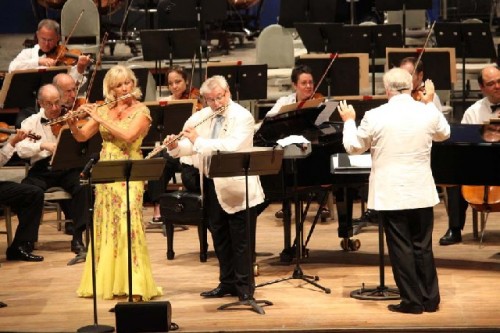 On Saturday, August 1, there was a festive mood as Sir James Galway celebrated his birthday with Leonard Slatkin conducting. There was a bit of the Blarney in the renowned Irish flute player. He confessed that it wasn't his birthday actually. That's a ways off on December 8 when he turns 70. But it was in fact the date of his 26th wedding anniversary. Later in the program he was joined on stage for flute duets by Lady Bonnie Galway. The stunning blonde was attired in a beaded satin, Kelly Green, what else, gown. They made some beautiful music together.