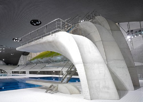 The nearby Aquatic Centre has a presence all of its own. It looks a bit like a dolphin jumping or a fish swimming upstream. Designed by Dame Zaha Hadid's firm (she was recently elevated by Queen Elizabeth to dame for services to architecture), this is elegant sculptural form on the exterior and especially in the diving venue space on the interior.
