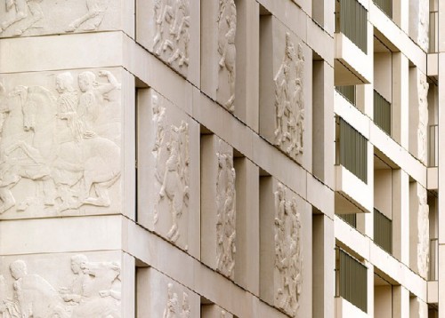 Included was a temporay structure dining hall that sat up to 5,000. A hair salon, a recording studio, a games room, a movie room and other communal spaces that allowed athletes to mingle and relax. However the most striking and sculptural aspect of the Village are details borrowed from Ancient Greece, the origin of the Olympic Games. These details are reproductions of the Elgin Marbles. Controversies aside (and there are severe controversies attached to the 2500 year old Elgin Marbles), they have been reproduced in concrete by Niall McLaughlin Architects as a visual connection to the origins of the Olympics.