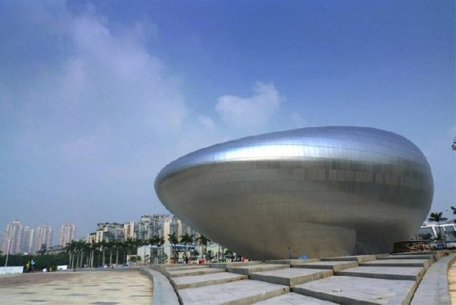 The shiny silver exterior seems to pay tribute to Anish Kapoor's more mirrored "Bean" in Millennium Park in Chicago. The museum facade is punctuated by randomly scattered small triangular windows. The architects see the edifice as part of a cloud or dense fog with windows representing birds in flight. To most observers, it looks like a flying saucer that has landed.