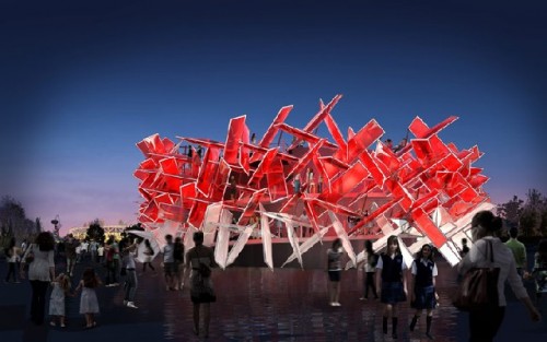 Now a decade and a half later, Coca-Cola has become more sophisticated. The BeatBox is built on the grounds of Olympic Park. Designed by the architect team of Asif Kahn and Pernilla Ohrstedt, the rather unexpected temporary pavilion is a red-and-white crystalline structure. It is formed by over 200 interlocked air cushions that trigger sound with touch or movement. It has a prickly pickup stix appearance, a little wild but controlled form. As visitors climbed the 656-foot long ramp to the top of the beatbox, they were able to create their own music by remixing the sounds of Olympic sports--splashes, footfalls, heartbeats, etc.