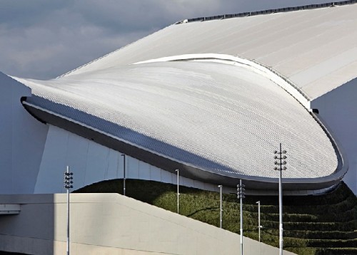 The architect based her design concept on the fluid geometry of water. Taking notice of the nearby rivers, the undulating roof sweeps up from the ground level like a wave. It does this gesture while enclosing the various performance pools of the Centre. This is an exquiste building both from a distance and nearby.