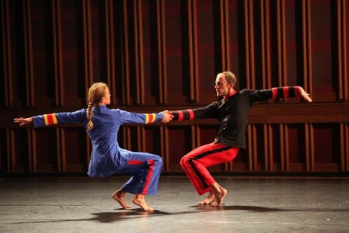 The first selection "A Lake" set to Haydn's "Horn Concerto No.2 in D," featuring the wonderful playing on French horn by Lauren Moore, revealed the company as rooted in the traditions of classical ballet. This was made visually apparent by the costumes designed by Martin Pakledinaz. There were soft, pastel colored skirts for the women and knee britches for the men. This gave emphasis to the lifts, leaps, partnering and turns that were appropriate to Haydn. The dance was in perfect harmony with the soothing and delightful music. The result was quite lovely. In that sense it was a perfect opening for a program that would end on the opposite end of the spectrum.