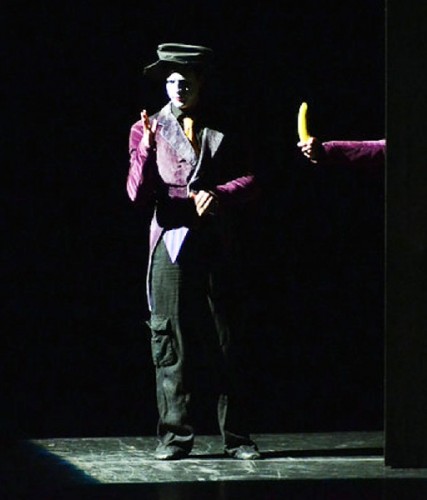 As is the use of clever lighting. In the tradition of the great clown Emmett Kelly the following spot becomes a character. It keeps eluding a mime who runs off stage returning with a revolver to shoot it. The threat seems to calm down the naughty spotlight. The gun is stuck in a pants pocket. Until another mime pulls it out and it has turned into a banana.