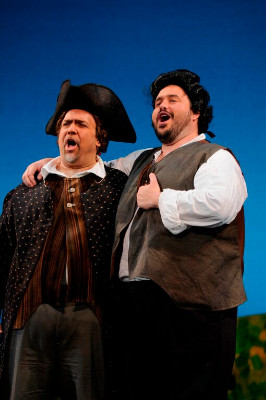 That was the high point. Costume designer Elisabetta Polito must have spent all her budget on those gowns, leaving little for the peasants in the next scene. The stiff, generic outfits worn by the chorus, particularly its male members, look like what you’d find in a “Waiting for Guffman” production. And Stephen Dobay’s sets, used in all scenes, which seemed so appropriate for the boudoir, failed to evoke the peasants’ humble home or the Richmond fair, especially with the pair of tacky signs added in the latter instance to denote the site of the action. Lighting designer John Cuff seems not to have noticed that by raising the candlepower after the first scene, he only brought attention to the production’s flimsiness. Worst of all was Ken Pierce’s choreography, although it didn’t hit the depths of Midsummer Opera’s “The Bartered Bride,” in which a childrens’ gymnastic troupe replaced what should have been Bohemian peasants dancing polkas and other regional dances. The chorus – now, granted, they are singers not dancers – moved so stiffly and formulaically that it would be an insult to high schools everywhere to say it was of high school musical quality.