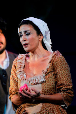 The two women in the cast were appropriately game. As Lady Harriet/Martha, soprano Joanna Mongiardo was amusing in the first scene, playing the bored aristocrat to the hilt. And her comic chops were evident in the Richmond fair auction and in her later ineptitude as a kitchen maid. She sang the appropriated “The Last Rose of Summer” - the rose is a gift from Lionel with whom she has fallen in love - with wistful romanticism. Vocally, Mongiardo sang with lovely tone throughout her range, but her voice sounded a little pinched as she negotiated high notes. As her maid and confidante, Nancy/Julia, mezzo Stephanie Kacoyanis was a good match, lively in her acting and expressive in her singing. In the first scene – I keep coming back to that because it was the most successful of the evening – their voices melded beautifully, although it was hard to understand anything they sang. (More of that in a minute.)