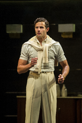 As we have come to expect from WTF Main Stage productions is a superb, art deco, curved wall, with period sconces, and a metal staircase to an upper level aptly designed by James Noone. For every scene Billie has a new period outfit created by the inventive and meticulous Tracy Christensen. She also had fun dressing the sleek and slender Hartrampf as an opportunistic, 1950s, ersatz producer. Certainly she has him looking the part.