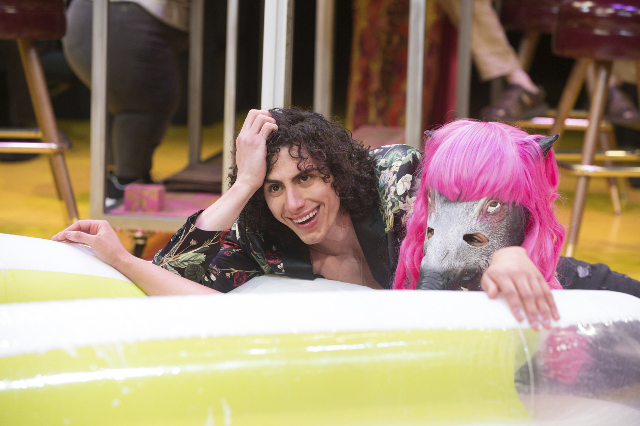 Much of the play is typical Shakespeare history, devoted to the machinations of a ruler and his enemies strategizing to defeat each other. An equally important thread is Prince Hal’s coming of age. We meet him as a wastrel, encumbered by a coterie of scoundrels, including the overindulged Falstaff. Daniel Jose Molina embraces the role of this fun-loving, irresponsible good-for-nothing prince with irreverent glee. Wide eyed and big mouthed, Molina depicts the merriment, the cajoling, and his fraternity with dunces. The crew hangs at Miss Quickly’s Boar’s Head Tavern. Here, pink and florescent-colored costumes, pig-headed girlies, bubble-filled wading pool, and booming rock music decidedly defy tradition.
