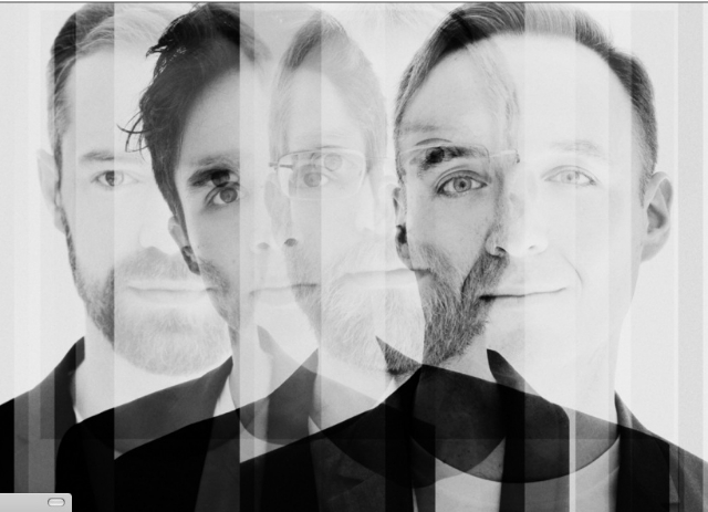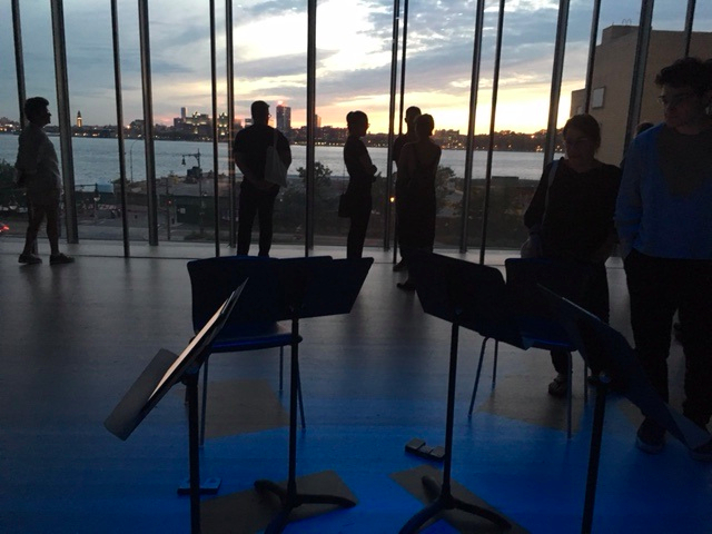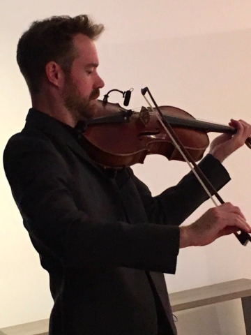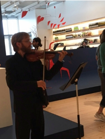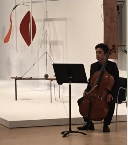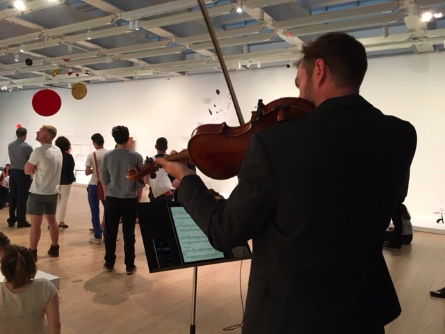In the center of the room on the south wall, cellist Jay Campbell and violinist Austin Wulliman are conventionally placed with their music stands before them. They do not seem to notice violinist Christopher Otto who stands at the east entrance, only a music stand dividing him from a roaming, and finally seated and standing still audience. At another entrance Jay Pickford Richards, violist, is in his own world, oblivious to in-your-face cameras, and the active audience. He is fixed on a digital timer, which brings the group together in time if not in space. The mood is set for a musical mobile.
