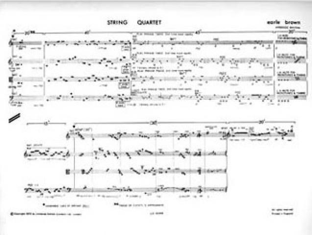 John Cage’s Thirty Pieces for String Quartet was written in time brackets. The first violin can enter any time in the first 45 seconds and exit after 30 to 65 seconds. The second unit can begin no earlier than 60 seconds into the piece. Already we see chance at work. We hear how irrational this music can become. It does, but in soft dynamics, and brackets composed of single notes or simple phrases.