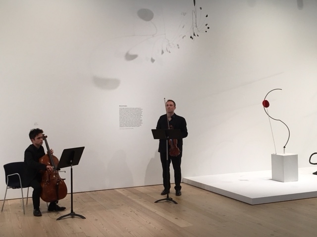 Like all great chamber performers, these instrumentalists talk back and forth to each other in sounds and notes. They are scattered across the eighth floor exhibit space at the Whitney Museum of American Art in which many Alexander Calder mobiles hang and stand.