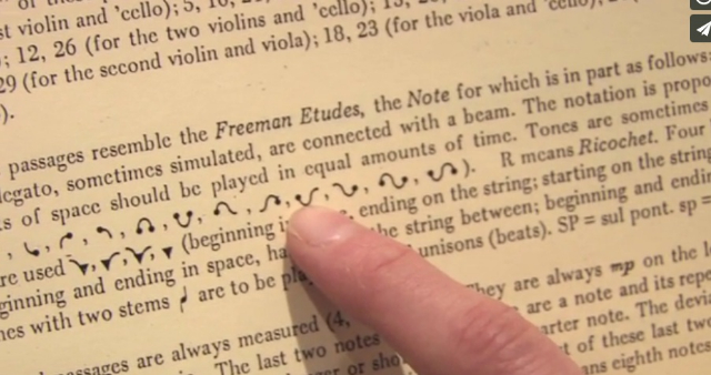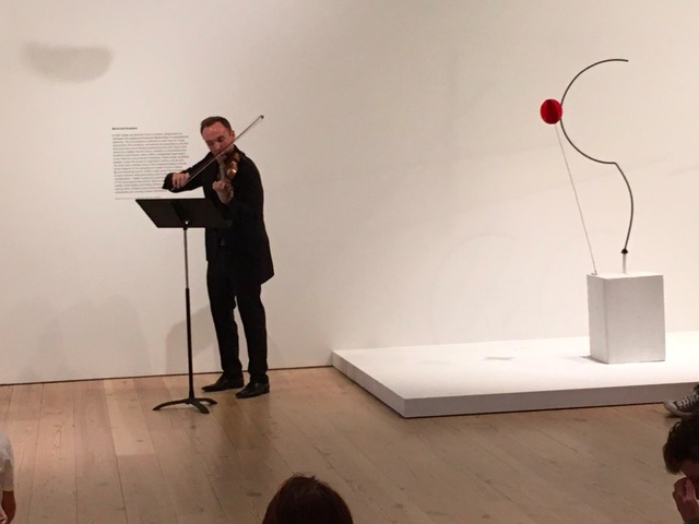 Calder and Cage were working at the same time and under the spell of many of the same thoughts. Beside Wulliman is a mobile that resembles a reversed question mark. Beside Campbell is a Calder work that suggests a juicy French kiss. For the audience, the sensation is one of many parts mixing. Yet the composer wrote that this is a piece for four soloists. Each performer has a choice of three textural possibilities. One is a pulse rhythm of tones and harmonics. Another is slower, more sustained lines and then there are complicated chromatic notes. This kaleidoscope of textures is mirrored in the mobiles variety of shapes and suggestions. Unpredictability of motion and sound suggestively collides in tone and shape. Each member of the JACK Quartet can draw forth sounds the excite and please. Often these are sounds you haven't heard before.