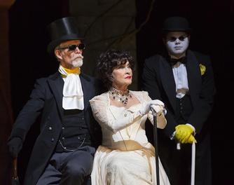 In stunning contrast into this grim winter setting Claire, elegantly gowned in a white silk coat with fur trim and festoons of jewels, arrives with a small entourage. She is accompanied by the tall, thin, former judge, now butler Rudi (Tom Nelis). There are two blind eunuchs Louis Perch (Matthew Deming) and Jacob Chicken (Chris Newcomer). They have the whitened faces of mimes in formal black with accents of yellow gloves and platform shoes.