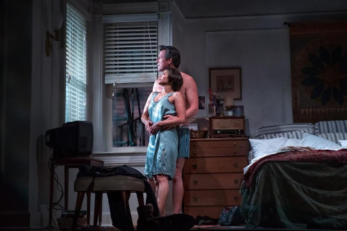 Over the course of the play with the metaphor of that cramped studio apartment we feel claustrophobic. We are locked in with the man who won’t go home and the woman who is too traumatized to want him to stay.